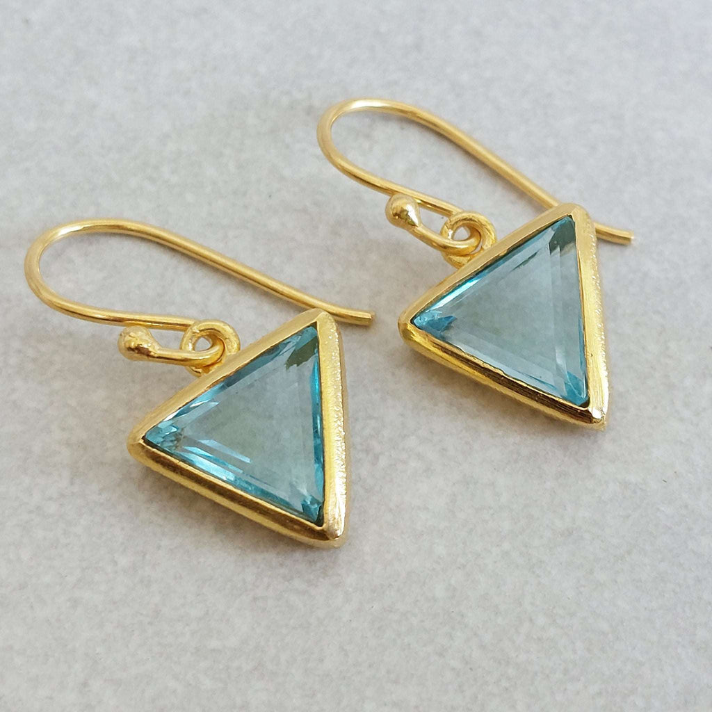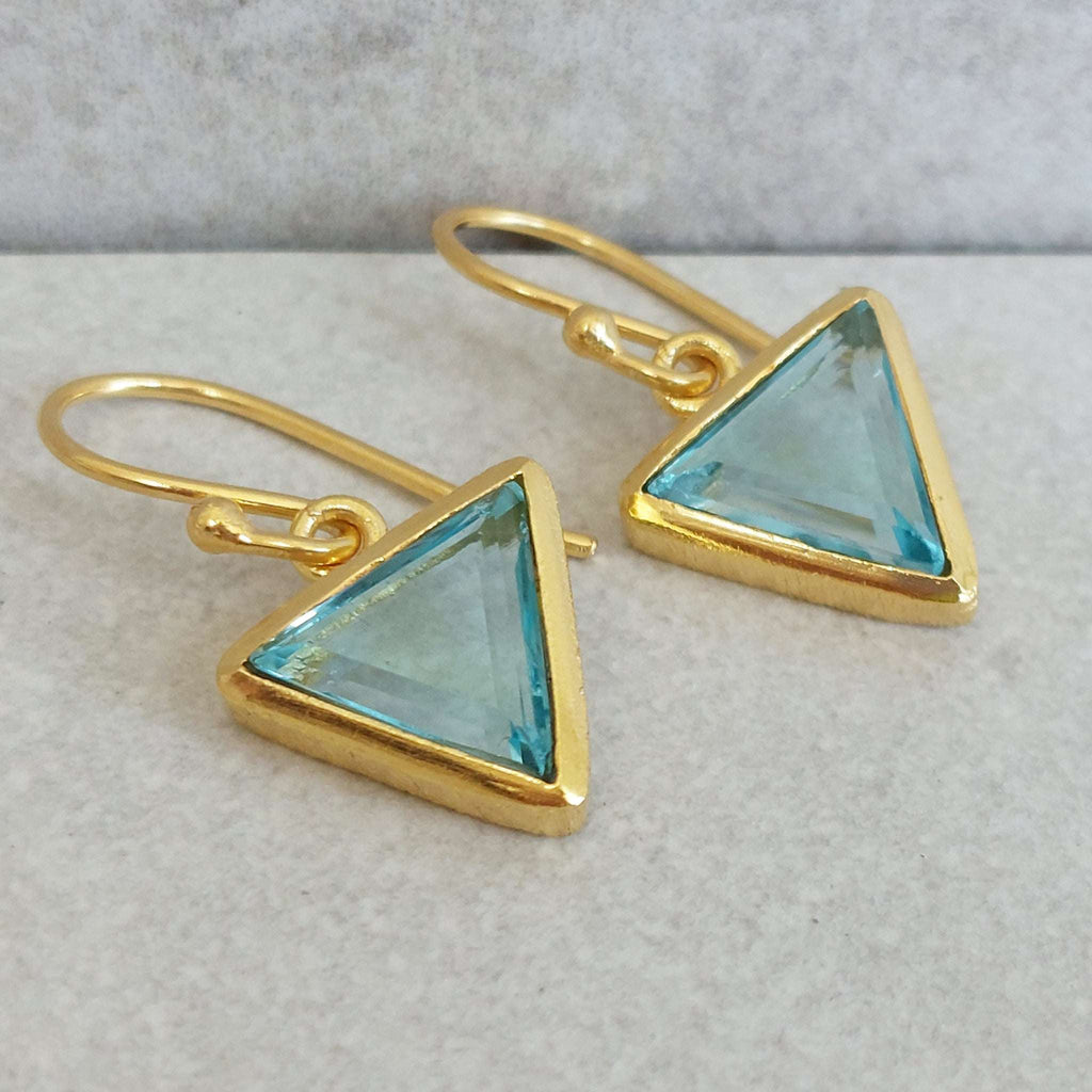 📌 Please note: The natural variations in blue topaz gemstones make each pair of triangle blue topaz gold earrings unique, with subtle differences in tone and sparkle, enhancing their distinctive charm.