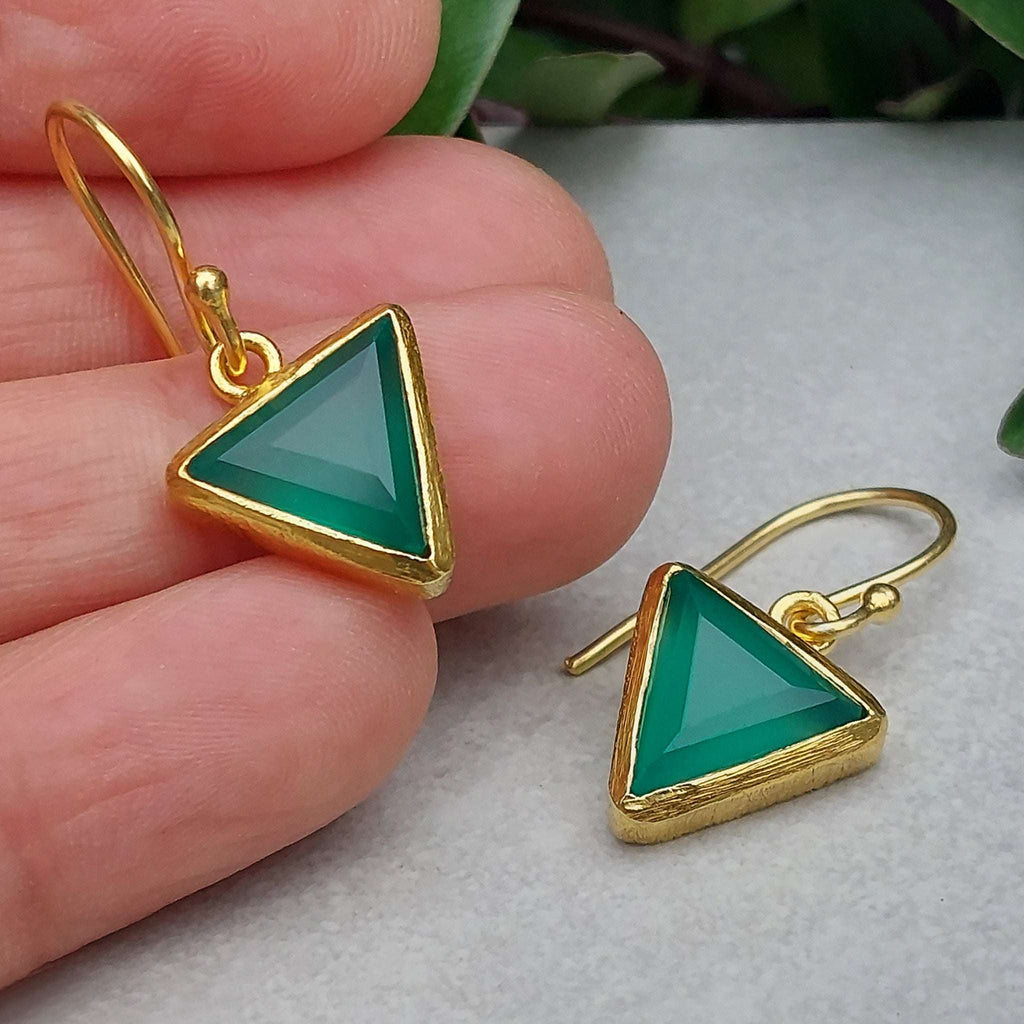💎 Add a pop of vibrant green with the Triangle Green Onyx Gold Earrings. Set in 18CT gold vermeil on sterling silver, these earrings feature bold green onyx gemstones in a sleek triangle design, perfect for adding elegance and sophistication to any outfit.